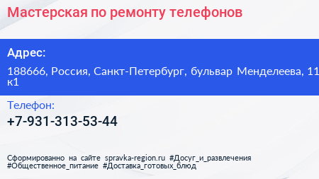 Мастерская по ремонту телефонов по адресу 188666, Россия, Санкт-Петербург, бульвар Менделеева, 11 к1 в дальнейшем Организация, размещена в следующих категориях: