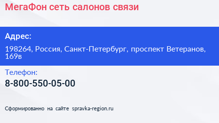 МегаФон, сеть салонов связи по адресу 198264, Россия, Санкт-Петербург, проспект Ветеранов, 169в в дальнейшем Организация, размещена в следующих категориях: