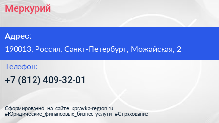 Меркурий по адресу 190013, Россия, Санкт-Петербург, Можайская, 2 в дальнейшем Организация, размещена в следующих категориях: