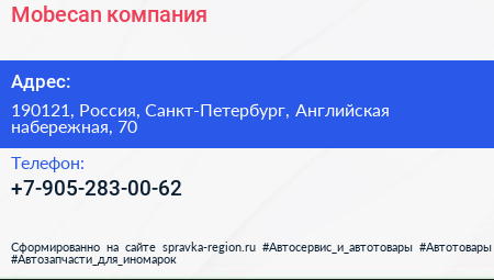 Mobecan, компания по адресу 190121, Россия, Санкт-Петербург, Английская набережная, 70 в дальнейшем Организация, размещена в следующих категориях: