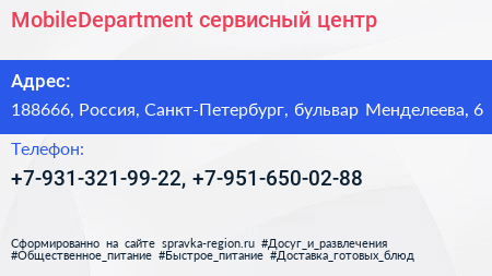 MobileDepartment, сервисный центр по адресу 188666, Россия, Санкт-Петербург, бульвар Менделеева, 6 в дальнейшем Организация, размещена в следующих категориях: