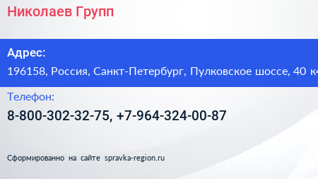 Николаев Групп по адресу 196158, Россия, Санкт-Петербург, Пулковское шоссе, 40 к4 в дальнейшем Организация, размещена в следующих категориях: