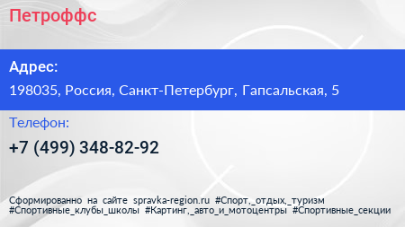 Петроффс по адресу 198035, Россия, Санкт-Петербург, Гапсальская, 5 в дальнейшем Организация, размещена в следующих категориях: