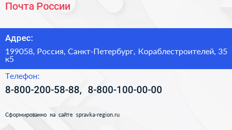 Почта России по адресу 199058, Россия, Санкт-Петербург, Кораблестроителей, 35 к5 в дальнейшем Организация, размещена в следующих категориях: