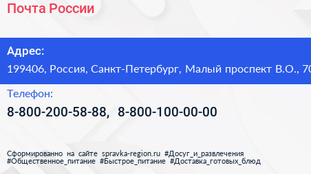 Почта России по адресу 199406, Россия, Санкт-Петербург, Малый проспект В.О., 70 в дальнейшем Организация, размещена в следующих категориях: