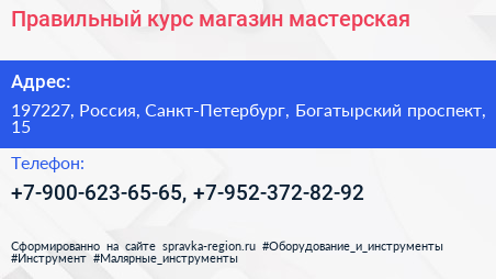 Правильный курс, магазин-мастерская по адресу 197227, Россия, Санкт-Петербург, Богатырский проспект, 15 в дальнейшем Организация, размещена в следующих категориях: