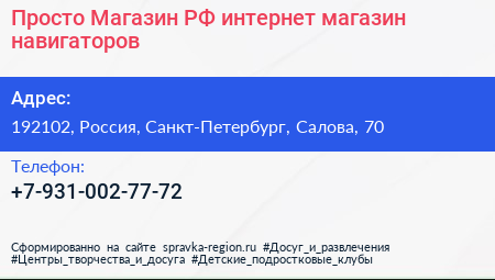 Просто-Магазин.РФ, интернет-магазин навигаторов по адресу 192102, Россия, Санкт-Петербург, Салова, 70 в дальнейшем Организация, размещена в следующих категориях: