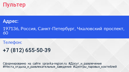 Пультер по адресу 197136, Россия, Санкт-Петербург, Чкаловский проспект, 60 в дальнейшем Организация, размещена в следующих категориях: