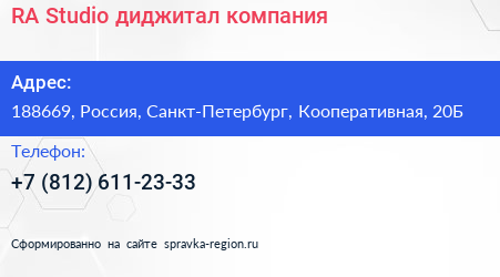 RA-Studio, диджитал-компания по адресу 188669, Россия, Санкт-Петербург, Кооперативная, 20Б в дальнейшем Организация, размещена в следующих категориях: