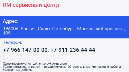 RM, сервисный центр по адресу 196006, Россия, Санкт-Петербург, Московский проспект, 109 в дальнейшем Организация, размещена в следующих категориях: