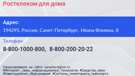 Ростелеком для дома по адресу 194295, Россия, Санкт-Петербург, Ивана Фомина, 8 в дальнейшем Организация, размещена в следующих категориях: