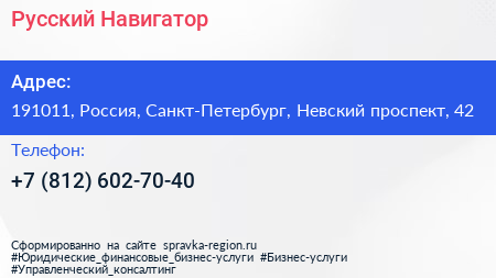 Русский Навигатор по адресу 191011, Россия, Санкт-Петербург, Невский проспект, 42 в дальнейшем Организация, размещена в следующих категориях: