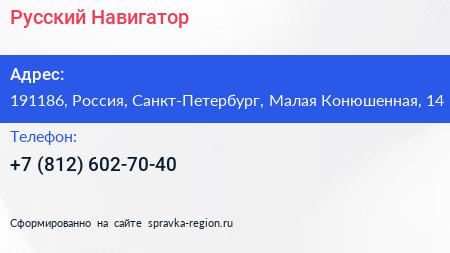 Русский Навигатор по адресу 191186, Россия, Санкт-Петербург, Малая Конюшенная, 14 в дальнейшем Организация, размещена в следующих категориях: