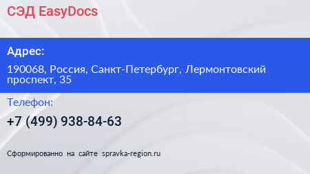 СЭД EasyDocs по адресу 190068, Россия, Санкт-Петербург, Лермонтовский проспект, 35 в дальнейшем Организация, размещена в следующих категориях:
