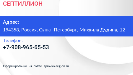 СЕПТИЛЛИОН по адресу 194358, Россия, Санкт-Петербург, Михаила Дудина, 12 в дальнейшем Организация, размещена в следующих категориях: