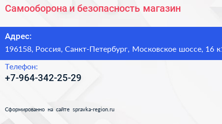 Самооборона и безопасность, магазин по адресу 196158, Россия, Санкт-Петербург, Московское шоссе, 16 к1 в дальнейшем Организация, размещена в следующих категориях: