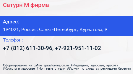 Сатурн М, фирма по адресу 194021, Россия, Санкт-Петербург, Курчатова, 9 в дальнейшем Организация, размещена в следующих категориях: