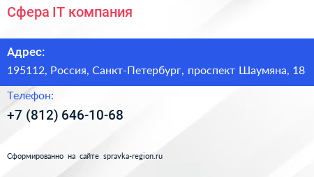 Сфера, IT-компания по адресу 195112, Россия, Санкт-Петербург, проспект Шаумяна, 18 в дальнейшем Организация, размещена в следующих категориях:
