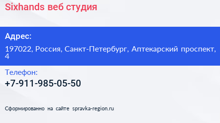 Sixhands, веб-студия по адресу 197022, Россия, Санкт-Петербург, Аптекарский проспект, 4 в дальнейшем Организация, размещена в следующих категориях: