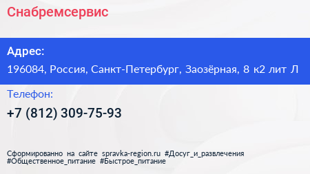 Снабремсервис по адресу 196084, Россия, Санкт-Петербург, Заозёрная, 8 к2 лит Л в дальнейшем Организация, размещена в следующих категориях: