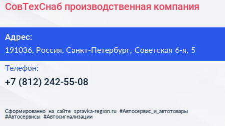 СовТехСнаб, производственная компания по адресу 191036, Россия, Санкт-Петербург, Советская 6-я, 5 в дальнейшем Организация, размещена в следующих категориях: