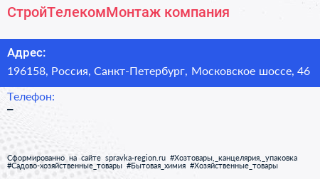 СтройТелекомМонтаж, компания по адресу 196158, Россия, Санкт-Петербург, Московское шоссе, 46 в дальнейшем Организация, размещена в следующих категориях: