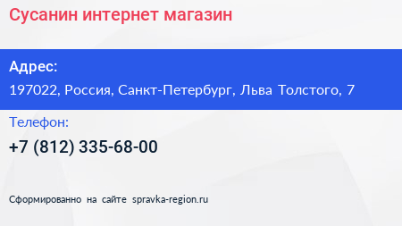 Сусанин, интернет-магазин по адресу 197022, Россия, Санкт-Петербург, Льва Толстого, 7 в дальнейшем Организация, размещена в следующих категориях: