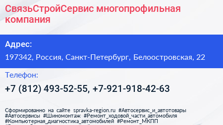 СвязьСтройСервис, многопрофильная компания по адресу 197342, Россия, Санкт-Петербург, Белоостровская, 22 в дальнейшем Организация, размещена в следующих категориях: