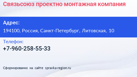Связьсоюз, проектно-монтажная компания по адресу 194100, Россия, Санкт-Петербург, Литовская, 10 в дальнейшем Организация, размещена в следующих категориях: