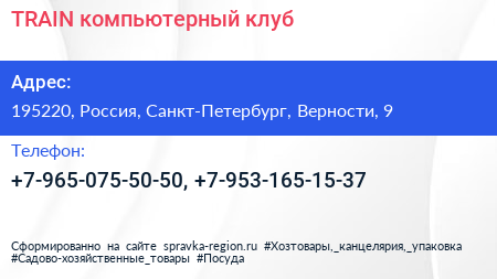TRAIN, компьютерный клуб по адресу 195220, Россия, Санкт-Петербург, Верности, 9 в дальнейшем Организация, размещена в следующих категориях: