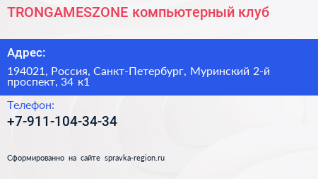 TRONGAMESZONE, компьютерный клуб по адресу 194021, Россия, Санкт-Петербург, Муринский 2-й проспект, 34 к1 в дальнейшем Организация, размещена в следующих категориях:
