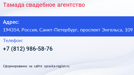 Тамада, свадебное агентство по адресу 194354, Россия, Санкт-Петербург, проспект Энгельса, 109 в дальнейшем Организация, размещена в следующих категориях: