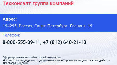 Техконсалт, группа компаний по адресу 194295, Россия, Санкт-Петербург, Есенина, 19 в дальнейшем Организация, размещена в следующих категориях:
