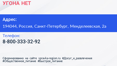 УГОНА.НЕТ по адресу 194044, Россия, Санкт-Петербург, Менделеевская, 2а в дальнейшем Организация, размещена в следующих категориях: