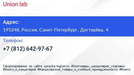 Union lab по адресу 195248, Россия, Санкт-Петербург, Дегтярёва, 4 в дальнейшем Организация, размещена в следующих категориях: