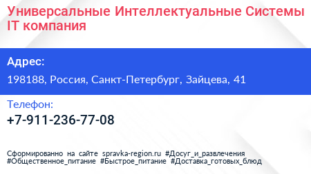 Универсальные Интеллектуальные Системы, IT-компания по адресу 198188, Россия, Санкт-Петербург, Зайцева, 41 в дальнейшем Организация, размещена в следующих категориях: