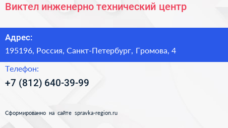 Виктел, инженерно-технический центр по адресу 195196, Россия, Санкт-Петербург, Громова, 4 в дальнейшем Организация, размещена в следующих категориях: