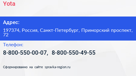 Yota по адресу 197374, Россия, Санкт-Петербург, Приморский проспект, 72 в дальнейшем Организация, размещена в следующих категориях: