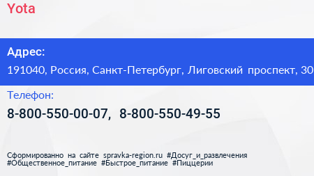 Yota по адресу 191040, Россия, Санкт-Петербург, Лиговский проспект, 30 в дальнейшем Организация, размещена в следующих категориях: