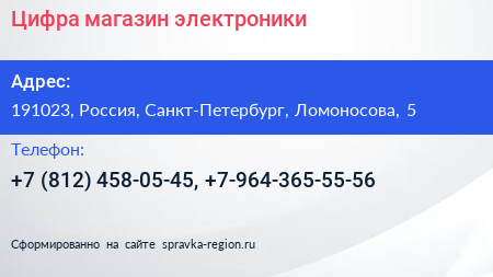 Цифра, магазин электроники по адресу 191023, Россия, Санкт-Петербург, Ломоносова, 5 в дальнейшем Организация, размещена в следующих категориях: