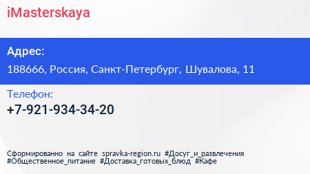 iMasterskaya по адресу 188666, Россия, Санкт-Петербург, Шувалова, 11 в дальнейшем Организация, размещена в следующих категориях: