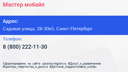 Мастер мобайл по адресу Садовая улица, 28-30к5, Санкт-Петербург в дальнейшем Организация, размещена в следующих категориях: