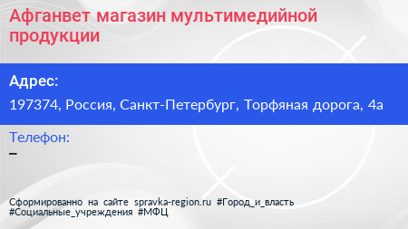 Афганвет, магазин мультимедийной продукции по адресу 197374, Россия, Санкт-Петербург, Торфяная дорога, 4а в дальнейшем Организация, размещена в следующих категориях: