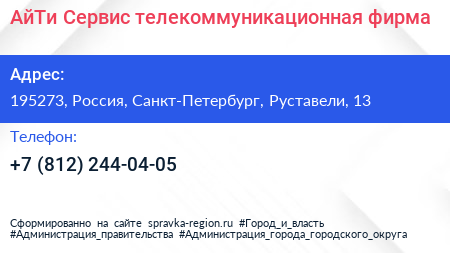 АйТи Сервис, телекоммуникационная фирма по адресу 195273, Россия, Санкт-Петербург, Руставели, 13 в дальнейшем Организация, размещена в следующих категориях: