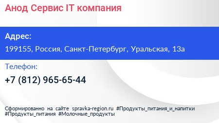 Анод-Сервис, IT-компания по адресу 199155, Россия, Санкт-Петербург, Уральская, 13а в дальнейшем Организация, размещена в следующих категориях: