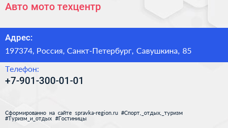 Авто-мото техцентр по адресу 197374, Россия, Санкт-Петербург, Савушкина, 85 в дальнейшем Организация, размещена в следующих категориях:
