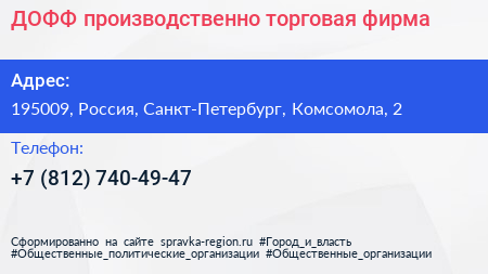 ДОФФ, производственно-торговая фирма по адресу 195009, Россия, Санкт-Петербург, Комсомола, 2 в дальнейшем Организация, размещена в следующих категориях: