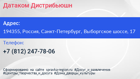 Датаком Дистрибьюшн по адресу 194355, Россия, Санкт-Петербург, Выборгское шоссе, 17 в дальнейшем Организация, размещена в следующих категориях: