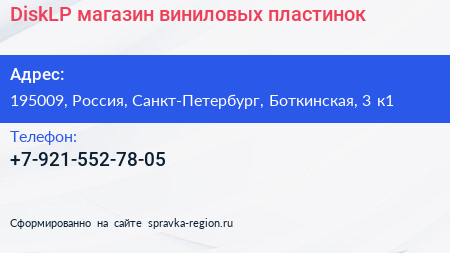 DiskLP, магазин виниловых пластинок по адресу 195009, Россия, Санкт-Петербург, Боткинская, 3 к1 в дальнейшем Организация, размещена в следующих категориях: