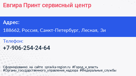 Евгира Принт, сервисный центр по адресу 188662, Россия, Санкт-Петербург, Лесная, 3и в дальнейшем Организация, размещена в следующих категориях: